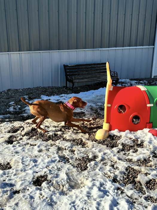 Our riverfront facility, located in downtown Port Byron, includes three large indoor play areas, along with a separate “meet and greet” area so our caring staff can learn about your pup’s personality and needs. Our indoor play area totals approximately 2500 square feet along with an additional 900 square feet of space to be used as necessary. We also have a 2800 square foot outdoor playground for your pup to enjoy!